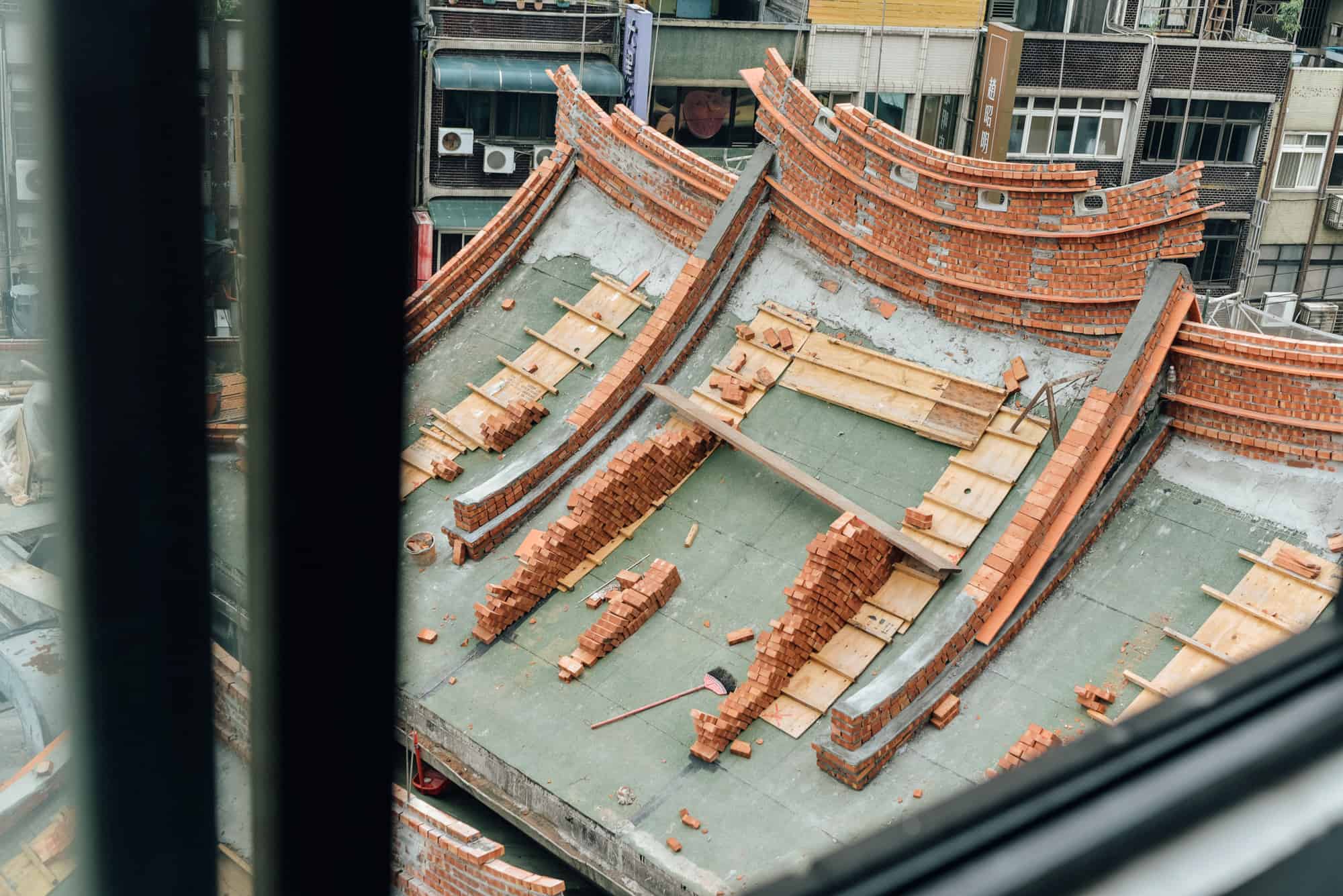 慈惠宮的地點是繁盛區域中的核心,放眼看出去的府中路與南門街,傳統市場與各種商家匯聚在此,所有老板橋人生活中很重要的地點。目前屋頂正在修繕中,將會花上兩年的時間重新整理,翻新也順便檢查、更新老建築的漏水與過舊問題。