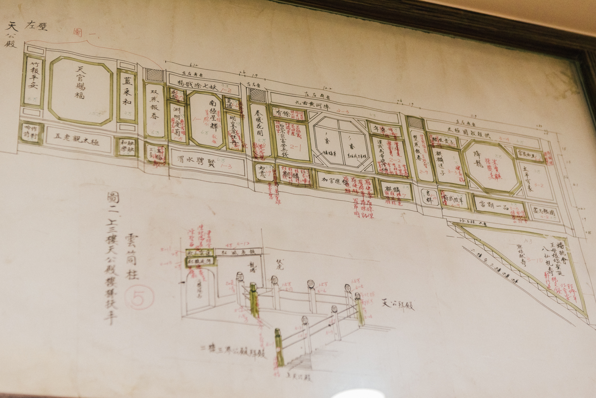 最後,許三郎主委還親自帶著我們參觀,現在正委請文化部認定的匠師,切割打磨地製作陶片,然後拼湊出屋頂上的每一隻神獸。然後也帶著我們到尚未對外開放的文物館,親眼見到了由2020年新北文化獎得主,蔡龍進老師在民國69年親手繪製的四海龍王門神像。