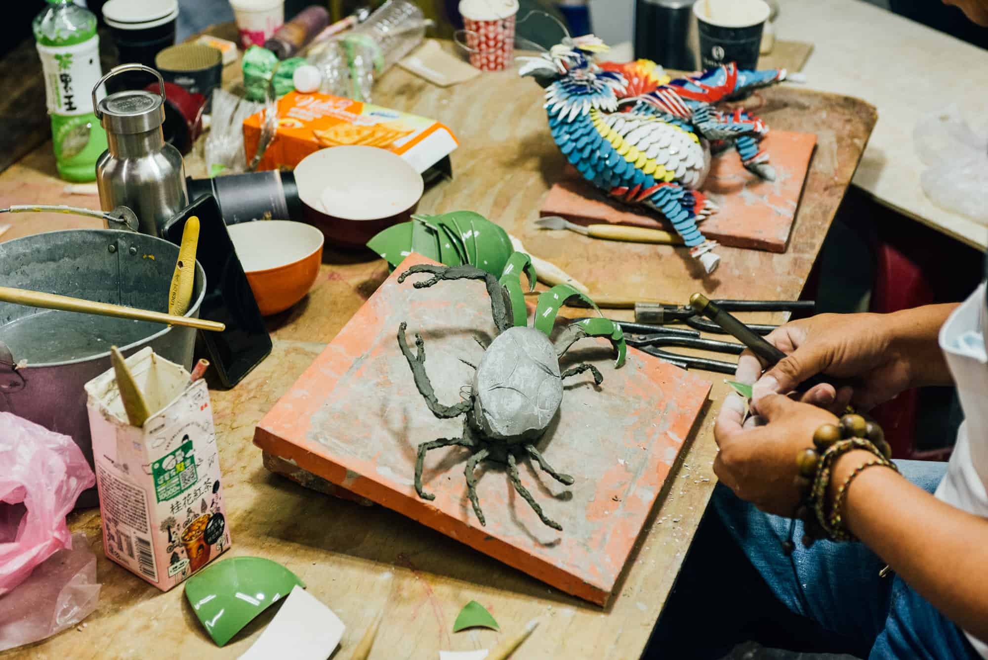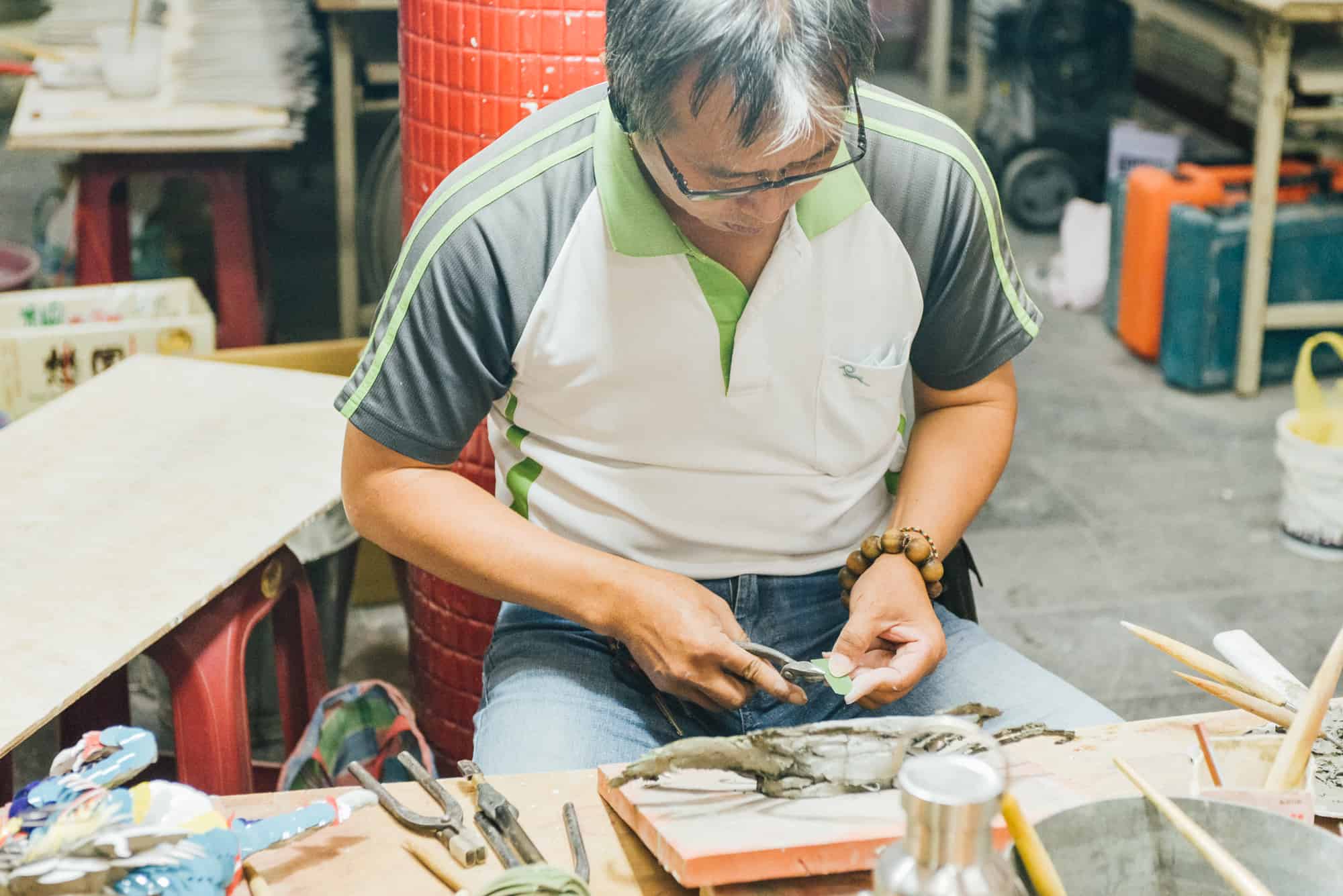 廟宇畢竟是信仰殿堂,總是能見識到許多高超的職人技藝。那天很幸運地能目睹到師傅做剪黏,將高溫燒製的陶片修剪,並拼湊成各種動物或是花卉樣貌,是難度極高且極珍貴的一門傳統技藝。